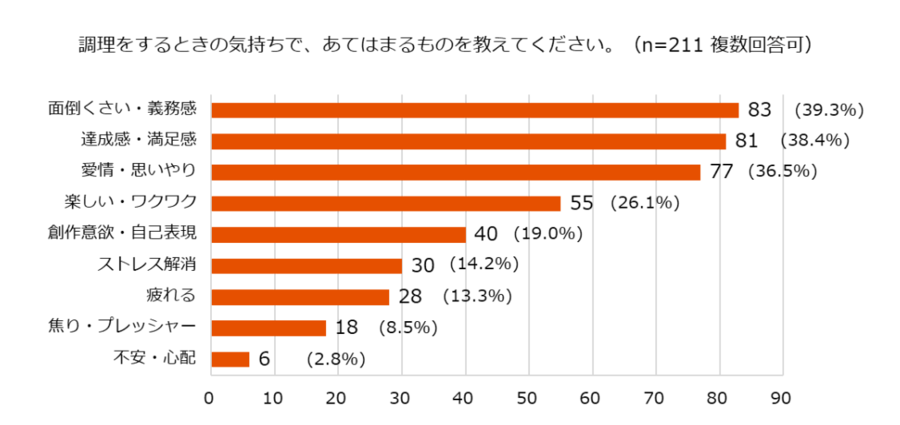 この結果をさらに興味深くするのが、「調理をするときの気持ち」についての回答です。最も多かったのは「面倒くさい・義務感」(39.3%)というネガティブなものでした。ところが、僅差で「達成感・満足感」(38.4%)、「愛情・思いやり」(36.5%)が続きます。この結果は、50代以上の方々が抱く、調理への複雑な心境を浮き彫りにしています。毎日の作業は「面倒」で義務的なものと捉えている一方、料理を完成させたときの「達成感」や、誰かのために作る「愛情」といったポジティブな感情が、同じくらい大きなウェイトを占めているのです。
