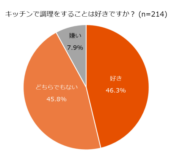 次に、調理に対する気持ちを深掘りしました。「キッチンで調理をすることは好きですか」という質問に対しては、「好き」(46.3%)と「どちらでもない」(45.8%)がほぼ半数を占め、「嫌い」はわずか7.9%でした。