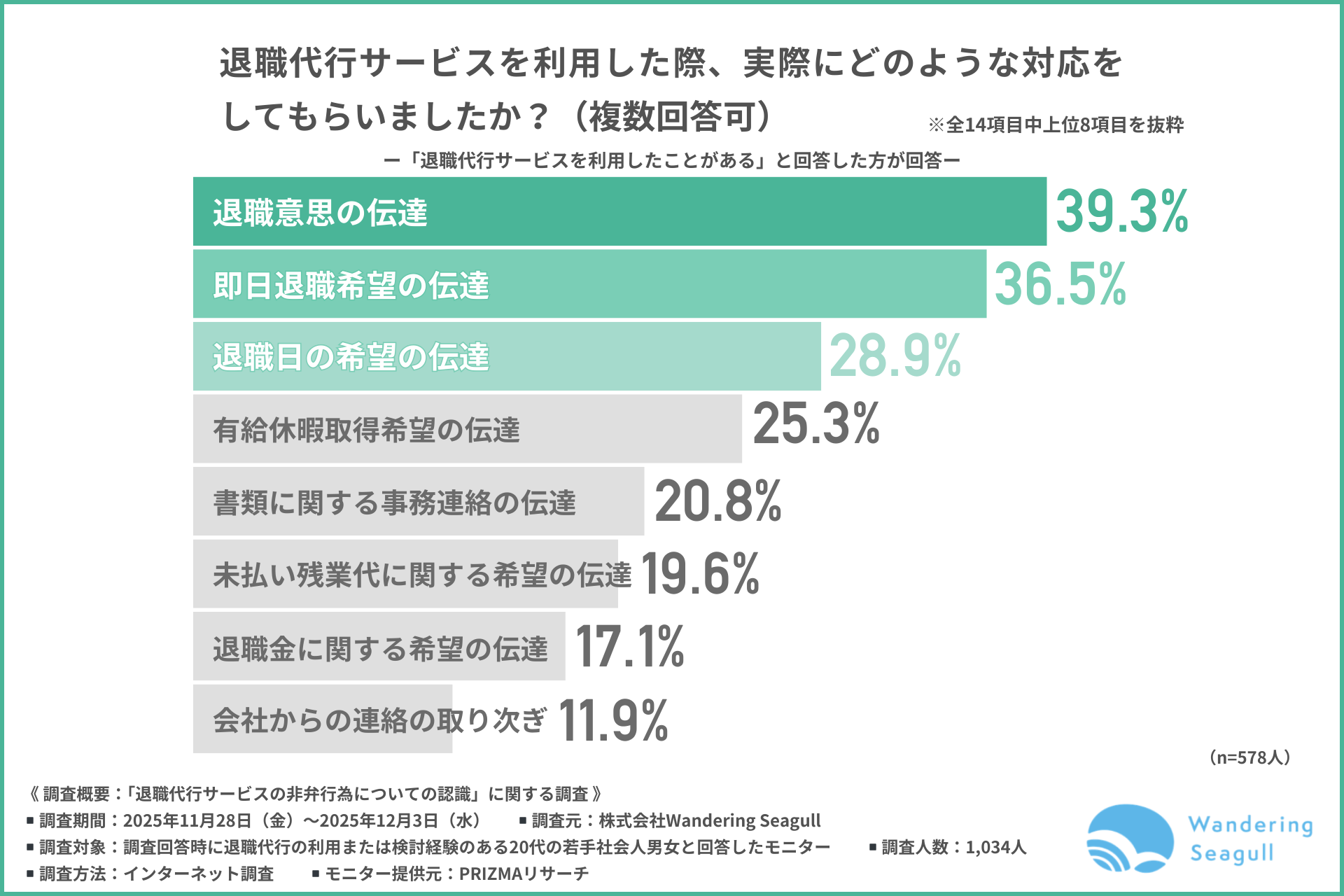 「退職代行サービスを利用した際、実際にどのような対応をしてもらったか」と尋ねたところ、『退職意思の伝達(39.3%)』『即日退職希望の伝達(36.5%)』『退職日の希望の伝達(28.9%)』など、「利用者の希望の伝達」が上位に挙がりました。