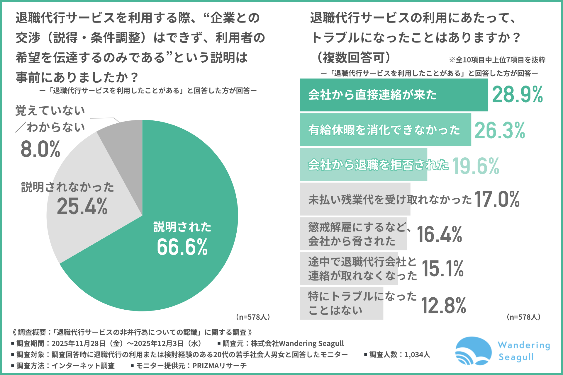 株式会社Wandering Seagull(所在地:新潟県新潟市、代表取締役:田村 広流)は、退職代行の利用または検討経験のある20代の若手社会人男女を対象に、「退職代行サービスの非弁行為についての認識」に関する調査を行いました。