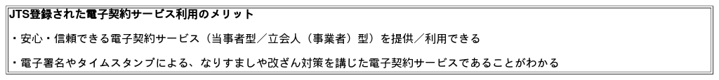 JTS登録された電子契約サービスは、立会人(事業者)型であっても、電子署名等の信頼性に関する厳格な要件を満たしたサービスとして、安心して利用できます。電子署名等のなりすまし対策を国際的にも通ずる基準に基づいて評価されており、利用者はより安心なサービスの選定/利用が可能となります。