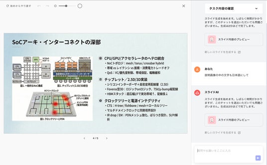 再生成を依頼すると、1-2分ほどで、スライド内の指定した箇所のみが編集されます。
