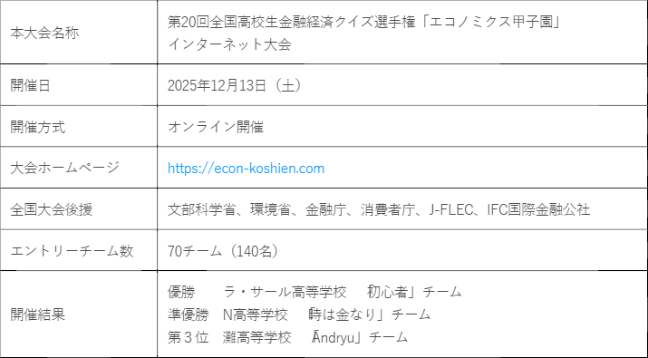住信SBIネット銀行株式会社(本社:東京都港区、代表取締役社長(CEO):円山 法昭、以下「住信SBIネット銀行」)は、金融経済教育の一環として、2025年12月13日(土)に開催された第20回全国高校生金融経済クイズ選手権「エコノミクス甲子園」インターネット大会(以下、本大会)を主催いたしましたことをお知らせいたします。