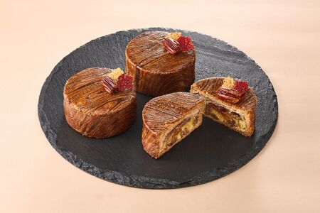 伝統的なレシピを忠実に守りながら、口当たりなめらかなアーモンドクリームと、フランス産のバターを使用した風味豊かな軽い食感のパイ生地で作るガレット デ ロワは、シンプルながら奥深い味わいが楽しめます。
