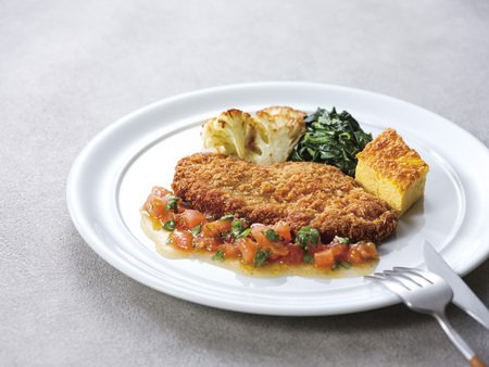 カリフラワーとほうれん草、フリッタータ(イタリア風オムレツ)を添え、見た目にも彩り豊かな一皿に仕上げています。