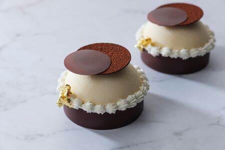 コーヒー風味のビスキュイショコラに、ほのかにブランデーが香るコーヒーシロップをたっぷりとしみ込ませた生地を重ね、なめらかなマスカルポーネクリームで覆いました。ココアパウダーをまとったチョコレートと金箔でシックな見た目に仕上げています。