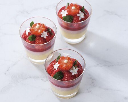卵の味わいやバニラビーンズの香りを活かした帝国ホテル伝統のカスタードプディングに、苺のクリームと甘酸っぱい苺のソースを合わせました。
