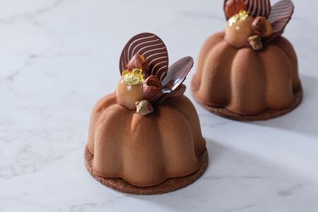 なめらかなヘーゼルナッツのムースとチョコレートやナッツでトッピングをした、食感と風味のコントラストをご堪能いただける一品です。