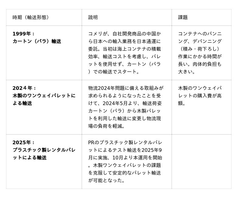 株式会社コメリ(新潟県 新潟市、代表取締役社長 捧 雄一郎 以下、コメリ)と、NIPPON EXPRESSホールディングス株式会社(東京都千代田区、代表取締役社長 堀切 智)のグループ会社である日本通運株式会社(東京都千代田区、代表取締役社長 竹添 進二郎 以下、日本通運)は、コメリが自社開発商品を輸入する際に、日本パレットレンタル株式会社(東京都千代田区、代表取締役社長 二村 篤志 以下、JPR)のレンタルパレットを導入し、国際輸送での一貫パレチゼーションを実現しました。