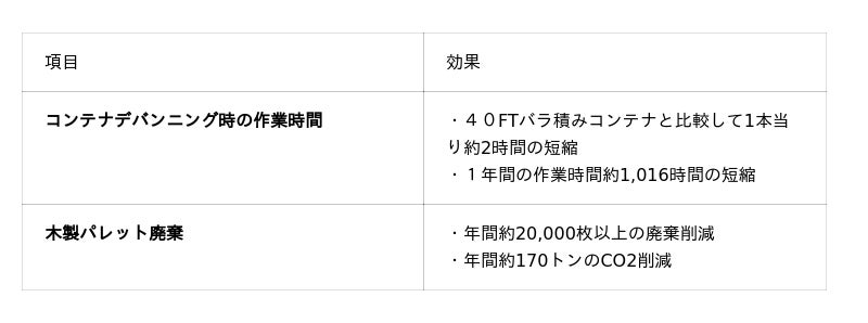 人手不足が深刻化している物流業界では、物流の結節点で生じる手荷役作業に起因する長時間労働や、過重な肉体的負担の解消が求められており、国も企業に対策を促しています。本件取り組みによる一貫パレチゼーションの導入は、海上コンテナへの積み込み時間を年間約1,016時間削減する効果が期待されるほか、従来発生していた木製パレットの廃棄にかかる環境負荷を軽減します。