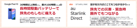 「au Starlink Direct」は、 バッテリーもIP68 の防塵防水性能※9と、長時間駆動のバッテリーを備えた本体も強靭な「Google Pixel 10 シリーズ」に発売当初から対応、災害・緊急時のつながる安心をより高めています。