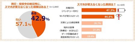 さらに、旅行・帰省中の被災経験者の4割以上(42.9%)が被災時にスマホが使用できなくなったと回答しました。