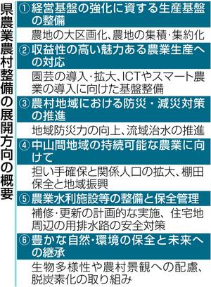 県は11年度に農業農村整備の展開方向を策定し、17年度に改定。農地の大規模化といった農業基盤の整備や用排水路の補修、防災対策などを進めてきた。