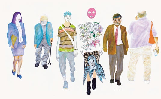 馬場まり子が描く「ひとびと」は、背景の余白のなかに半分溶け込んだような、淡い存在として画面に存在しています。地面の不在と、半ば透けるような「ひとびと」が醸す、ゆらぎのような空気が「人間社会」という圧を感じさせず、描かれた人たちには、ぼんやりとした幸福感が滲みます。そこには描き手による、人々への“いとおしさ”が重なっています。