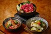 和の趣で存在感あるティースタンドに盛り付けた前菜や小鉢は、肉・魚・野菜をバランスよく取り入れ、鶯が告げる早春の訪れを一品一品に映し出しました。まるでアフタヌーンティーのように少しずつ多彩な味わいが楽しめ、心華やぐ上質なひとときを演出します。続く小鍋は、一人ひとりが自分のペースで気兼ねなく楽しめるように仕立てた3種から選べる『ごほうび鍋』。温かな湯気に心までほぐれるような時間をお過ごしいただけます。