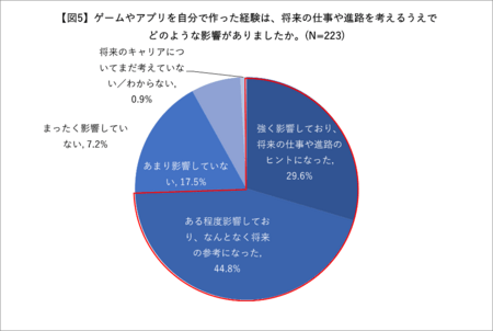 実際にゲームやアプリを作った経験については、「試した程度ならある」の回答も含めると7割以上経験があることが判明(図4)。またゲームやアプリを自分で作った経験が、「将来の仕事や進路に強く影響を与えた」と答えたのは29.6%、「ある程度影響した」と回答したのは44.8%(図5)と、合計7割以上が将来のヒントになったことが伺え、受け身ではなく“作る体験”が将来像を描くきっかけになっている可能性があることがわかりました。