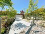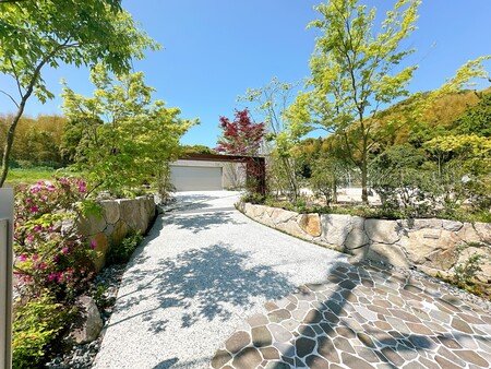周囲の借景と調和する自然石を採用したアプローチの土留め