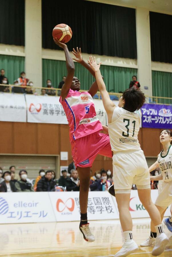 先発はデンベル、久井咲良、金沢みどり、森田真衣、中道玲夏。序盤から森田のミドルシュートや中道の3点プレーなどで互角の戦いに持ち込み、43-40で前半を終えた。