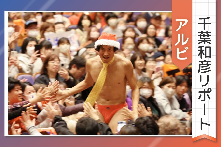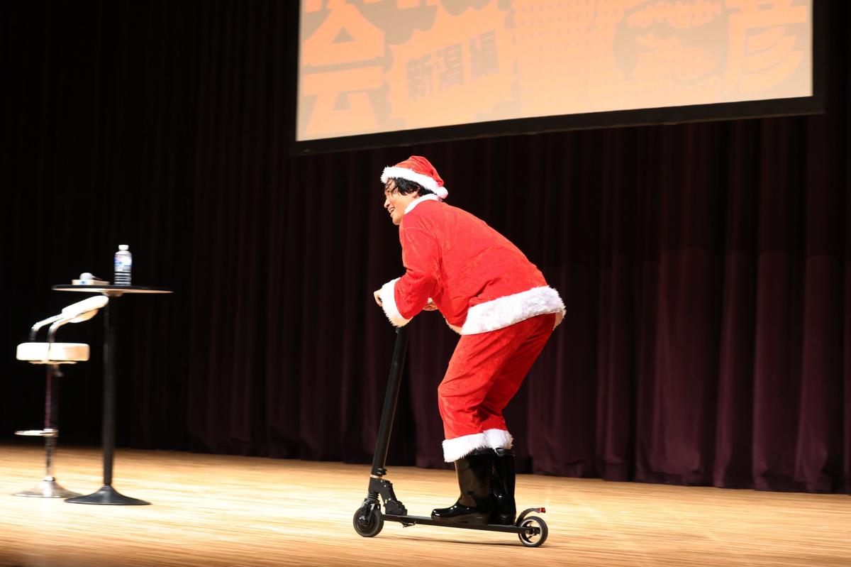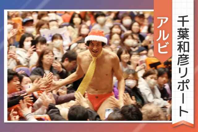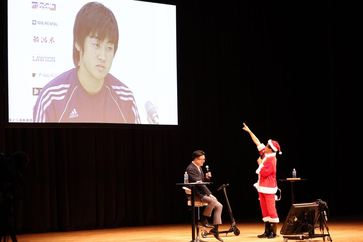 なぜかキックボードに乗って、サンタクロース姿で登場した千葉。1回通り過ぎて、戻ってくるお約束を披露した。続いて満員のサポーターたちを見渡し、「皆さん、相当ひまですね(笑)」と呼び掛けると、会場は温かな笑い声に包まれた。