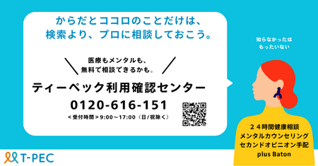 受診すべきか迷ったときや、応急処置について確認したいときなどは、医師・看護師をはじめとする医療従事者が丁寧に対応いたします。ティーペックのサービスは、生命保険などの付帯サービスとして無料でご利用いただけます。
