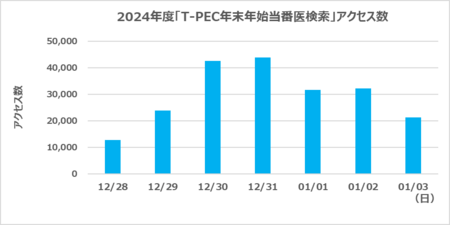 24時間健康相談等の健康支援サービスを提供するティーペック株式会社(本社:東京都台東区、代表取締役社長:鼠家 和彦)は、毎年公開している「T-PEC年末年始当番医検索」の過去アクセスデータを分析し、検索数のピーク日と診療科別の利用傾向をまとめました。年末年始は医療機関の休診が多く、急な体調不良に備えた情報ニーズが高まる時期です。今年の利用に役立つ参考情報として公開します。
