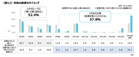 また、「あけおめ」の返事のタイミングについて、送る側(返事をする側)は1月4日から7日までに「遅いと感じ始める」人が52.4%。松の内には間に合っているのに、約半数が「返事をするにはもう遅い」と感じています。一方、受け取る側(返事をもらう側)は、松の内終了後の1月8日以降も「受け入れられる」と57.8%が答えており、送る側と受け取る側に意識の差が生じています[図12]。年始の挨拶を「松の内」に済ますという慣習にとらわれない、「新・松の内」ともいえる期間が1月8日以降に存在するといえそうです。