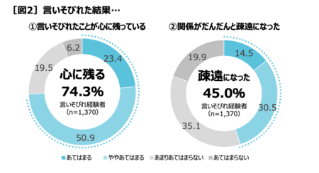 これまでに言いそびれた経験があるかと聞くと、全体の68.5%(多く思い当たる25.0%+数回思い当たる39.5%+1回思い当たる4.1%)が言いそびれています[図1]。これまでに言いそびれ経験がある1,370人に言いそびれたことで起きたことを聞くと、74.3%(あてはまる23.4%+ややあてはまる50.9%)が「言いそびれたことが心に残っている」と答え、45.0%(あてはまる14.5%+ややあてはまる30.5%)が「関係がだんだんと疎遠になった」と答えました[図2]。