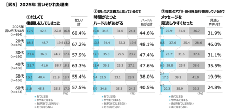 2025年に言いそびれがある人に、言いそびれにつながってしまう理由を聞くと、「忙しくて後回しにしてしまった」(60.4%=あてはまる17.9%+ややあてはまる42.5%)が多いものの、20代では「即レスが正義だと思っているので、時間がたつと返す・伝えるハードルがあがる」(48.1%=あてはまる13.8%+ややあてはまる34.4%)や「メッセージアプリや複数のSNSを並行して使っているので、メッセージを見逃しやすくなった」(46.0%=あてはまる8.5%+ややあてはまる37.6%)が他の年代に比べて多いのが目立ち、これからも言いそびれの理由として増えていきそうです[図5]。