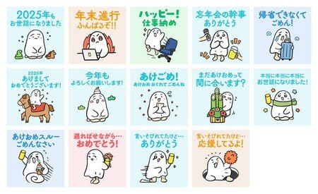 年末年始に使いやすいノンデネの新スタンプ 14 種類を、 12 月 18 日(木)より追加配信しました。「忘年会の幹事ありがとう!」など、年末年始に起こりやすい「言いそびれ」をチャーミングに解消できるスタンプです。