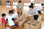 かるたは、懐中電灯や携帯ラジオなどの防災グッズを床に並べて取り合った。生徒たちが「どうしよう。近くのトイレが使えない」と読み札を読み上げると、児童は勢いよく携帯トイレに手を伸ばしていた。