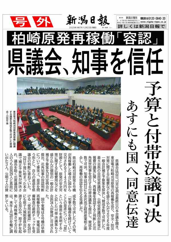 【号外】柏崎刈羽原発再稼働「容認」 新潟県議会、花角英世知事を信任 2025/12/22 15:05 (最終更新: 2025/12/22 15:05) PDFで号外を見る トップページで最新情報を見る 関連ニュース 【号外】新潟県知事が柏崎刈羽原発再稼働を容認 11/21 【号外】日経平均初の5万円台 10/27 【号外】新首相に高市早苗氏、女性で初めて選出 10/21 【号外】燕市の新市長に前市議の佐野大輔氏 10/20 【号外】北信越高校野球・帝京長岡が優勝 10/19 【号外】公明党が連立政権離脱へ 10/10 【号外】ガザ全人質解放へ 10/9 【号外】ノーベル化学賞に北川進京都大特別教授 10/8 ノーベル化学賞に京都大特別教授の北川進氏ら 10/8 【号外】ノーベル生理学・医学賞に大阪大栄誉教授の坂口志文氏ら3氏 10/6 【号外】自民党新総裁に高市早苗氏 10/4 【号外】石破茂首相が辞任の意向 9/7