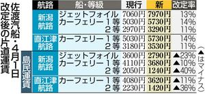 佐渡汽船(佐渡市)は23日、2026年4月1日に最大14%値上げする上限運賃改定を国土交通省北陸信越運輸局に申請したと発表した。認可されれば旅客運賃や自動車航送運賃が3〜14%の値上げとなる=表参照=。06年から導入した「燃料油価格変動調整金(燃油サーチャージ)制度」や消費税導入での価格変動はあったが、上限運賃改定は1996年以来約30年ぶり。一方、島民運賃は国の「特定有人国境離島地域」の支援があることなどから最大で40%と大幅な値下げとなる。