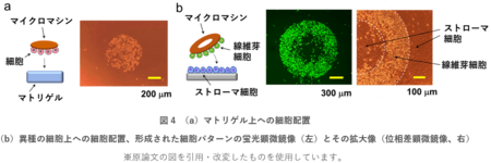 作製したマイクロマシンを用いて、30分という短時間で標的部に細胞を望みのパターンで配置することができました。図4aに円形のマイクロマシンを用いて、間葉系幹細胞を生体組織のモデルとなるゲル(マトリゲル)上に円形パターンで配置した結果を、また図4bにリング型のマイクロマシンを用いて、線維芽細胞を異種の細胞(ストローマ細胞)上にリング状パターンで配置した結果を示します。