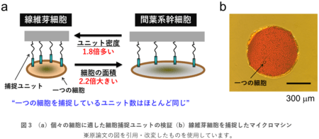 生体内に細胞を配置する場合、生体への負荷を減らすために、極力短時間で配置操作を終える必要があります。配置に要する時間はマイクロマシン表面の細胞捕捉ユニットの数に左右されます。ユニットが多いと、確実に細胞を捕捉できるものの、脱離に時間がかかります。逆に、少ない場合は、素早く脱離できますが、細胞を十分に捕捉できません。そこで、さまざまな密度でユニットを結合させたマイクロマシンを作製し、マシンの細胞捕捉能と、タンパク質溶液に一定時間暴露した際のマシンからの細胞の脱離挙動を検証しました。その結果、確実な捕捉と短時間(30分)での脱離を実現するために、間葉系幹細胞と線維芽細胞ではマシンに結合させるユニット密度が1.8倍違うことが分かりました(図3a)。また、マシンに捕捉された細胞の面積は、間葉系幹細胞では、線維芽細胞に比べて2.2倍大きいことが分かりました。これらの結果は、どちらの細胞でもほとんど同じ数のユニット(約2×107個/1細胞)で捕捉されうることを示しており、今後多様な細胞に対応したマイクロマシンを開発するうえで重要な指針になります。図3bに線維芽細胞を捕捉した円形のマイクロマシンの様子を示します。マシン全面に良好に細胞が捕捉されていることが分かります。
