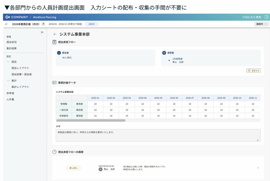 (※)現場部門からの要員計画案の収集・進捗管理・人件費計算・集計表の作成を効率化するとともに、予実モニタリングをリアルタイムに実施できる製品です