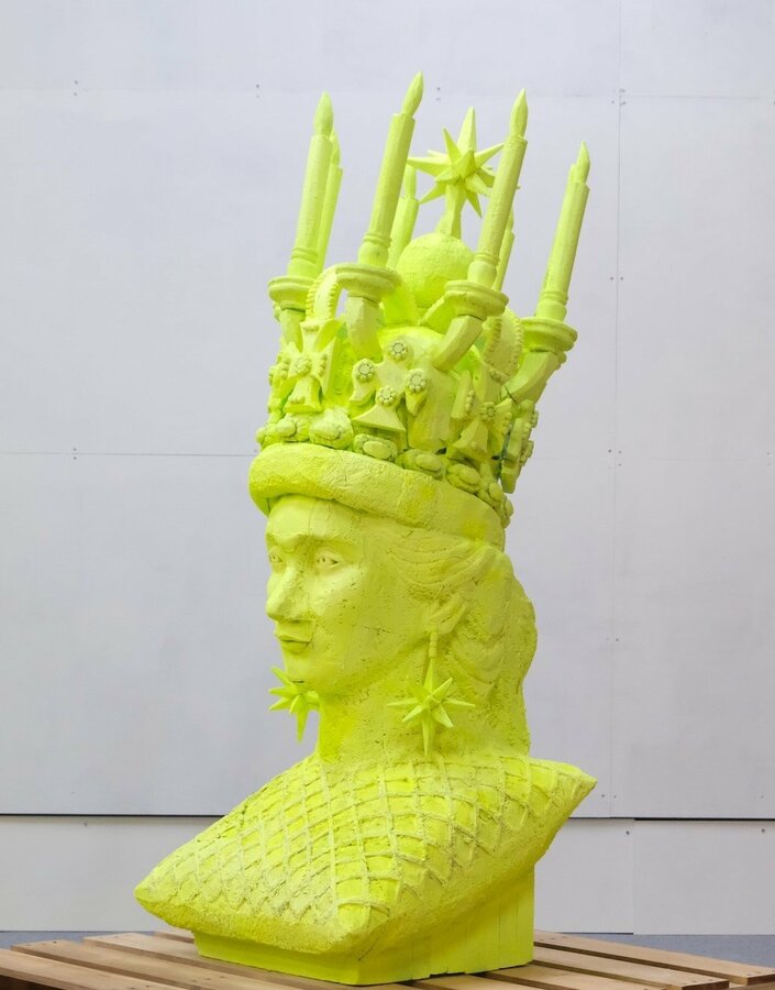 今回は表層的なレイヤーの中の厚みや重さといったものにフォーカスして制作を行いました。立体は以前から挑戦したい課題でした。スタイロフォームという軽くて耐久性のある現代の素材でありながら、過去からの伝統や重さといった重厚感を表現できないかと試みました。あえて軽量で現代的な色彩に、どこか虚な視線で夢か現実のどちらの世界にいるのかわからない女王といった存在。絵画の世界観と両方の往還ができるようにしたいです。もっとスケールの大きな空間構成も視野に入れて考えています。