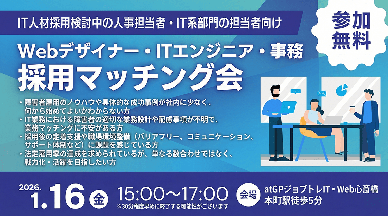 障害者の就労支援を中心にソーシャルビジネスを展開する株式会社ゼネラルパートナーズ(本社:東京都千代田区、代表取締役社長:進藤均)は、2026年1月16日(金)に、就労移行支援事業所「atGPジョブトレIT・Web心斎橋」にて、Webデザイナー・ITエンジニア・事務 採用マッチング会を対面・オンラインのハイブリッド型で開催します。