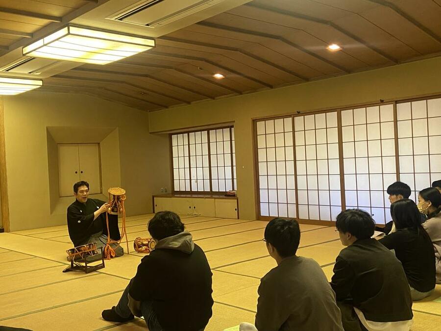 実演鑑賞では、能楽師と日本舞踊家・邦楽囃子家というジャンルの異なる実演家の方が6名もお集まりくださり、お話と実演をしてくださるという大変贅沢なひと時となりました。学生たちも鑑賞と体験を楽しみ、能楽という中世芸能と日本舞踊という近世芸能の違いも実感したようでした。