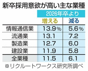 リクルートワークス研究所は、2027年卒の大学生・大学院生の採用数が26年卒よりも「増える」と答えた民間企業は11・5%だったとの調査結果を発表した。前年の13・2%からは低下したものの、担当者は「採用意欲は引き続き堅調だ」としている。