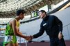 副音声ラジオでMCを努める レポーターの宮原さん(左)と 選手と熱い握手を交わす桐生選手(右)