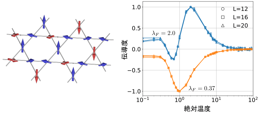 1つ目は、近接スピン相関と遠距離スピン相関の競合です。高温では近接相関が支配的ですが、温度が下がると遠距離相関の影響が大きくなり、両者の寄与が競合することで非単調な振る舞いが生じます。2つ目は、高磁場領域ではスピン相関自体が非単調な温度依存性を示すことです。この結果、ホール伝導度の符号反転を引き起こします。これらの効果は、フェルミ波長の値によって異なる現れ方をすることも明らかになりました。