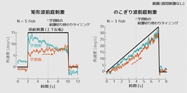 まず、予測性OKRを獲得することがよく知られている視覚刺激と同様に、矩形波速度状に頭部を回転させ3時間学習させた。その前後に学習時の前庭刺激よりも回転時間が2倍の矩形波状前庭刺激を与えた。一方で、頭の回転を検知する三半規管は加速度センサーとして働き、一定速度での頭の回転を徐々に検知できなくなる特性を持つ。そこで、三半規管を刺激し続けることができるよう、のこぎり波状に頭の速度を変化させる前庭刺激でも同様の実験を実施した。どの条件でも、OKRが誘発されないよう暗闇内で前庭刺激を与えた。
