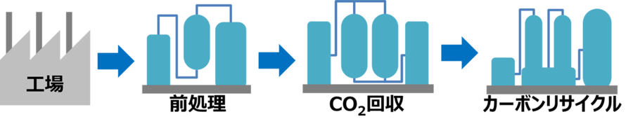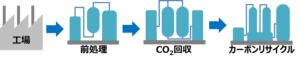 異業種 5 社連携で開発に取り組む「CO₂回収装置」は、工場の燃焼排ガスなど比較的高濃度の気体から CO₂を回収するアミン含有ゲル技術と、排熱を利用した省エネ運転、さらに NOx(窒素酸化物) /SOx(硫黄酸化物)の除去前処理を組み合わせた技術です。プラントのコンパクト化や、他のソリューションとの組み合わせで、中小企業にも導入しやすいモデルの構築を目指します。