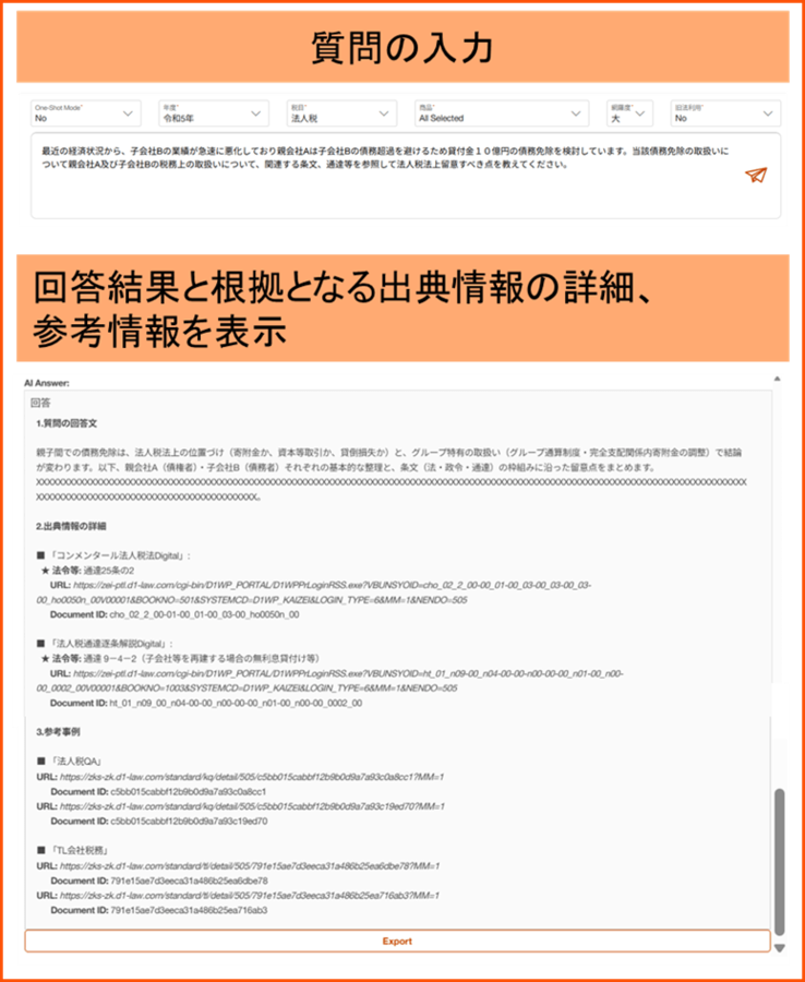 「Tax Guidance Assistant」は、法律系出版社として120年以上にわたり法令情報を提供してきた第一法規が保有する税務データベースを基盤としています。さらに、PwC Japanが収集した税務に関する一般公開情報と組み合わせて、ユーザーからの質問に対する生成AIの回答精度の向上を目指しました。これにより、税法の把握や実務において、コンメンタールなどを含む価値ある情報へのアクセスが可能となります。さらにPwCのAI知見を活用することで、税務に関する質問に対し、信頼性の高い情報源に基づいた回答を迅速に生成します。回答内容には、第一法規データベースの出典情報を明示する設計を採用しており、情報の正確性と透明性を担保しつつ、著者の権利を害することなく安心して利用できる仕組みとなっています。