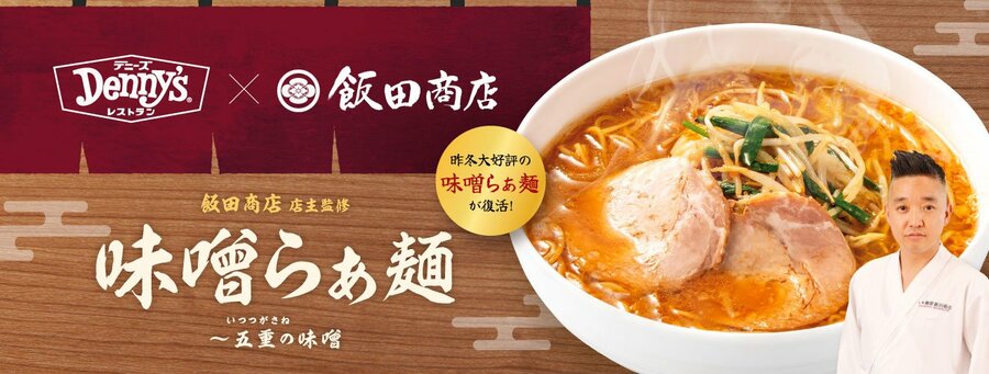株式会社デニーズジャパン(本社:東京都千代田区、代表取締役:小松雅美)が運営するデニーズは、日本一予約が取れないとも言われる人気ラーメン店「飯田商店」店主・飯田将太氏監修による『味噌らぁ麺~五重(いつつがさね)の味噌』を、2025年12月17日(水)より期間限定で復活販売しました。