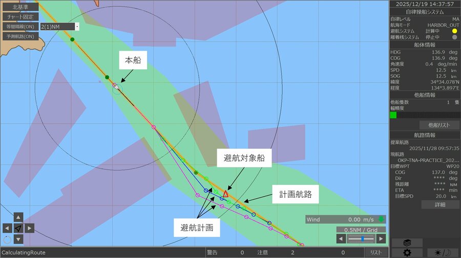 自船や周辺を航行する船舶などの行動を予測し、衝突・座礁を防止するための避航計画の策定、及び風などの気象条件に応じた最適な離着桟計画を策定するシステム。船員の監視のもと、自動で衝突・座礁を回避し、従来操船者が手動で行っていた航海当直時の情報収集、状況分析、避航計画の立案などをサポートすることで操船者の負担を軽減し、安全性の向上に寄与します。