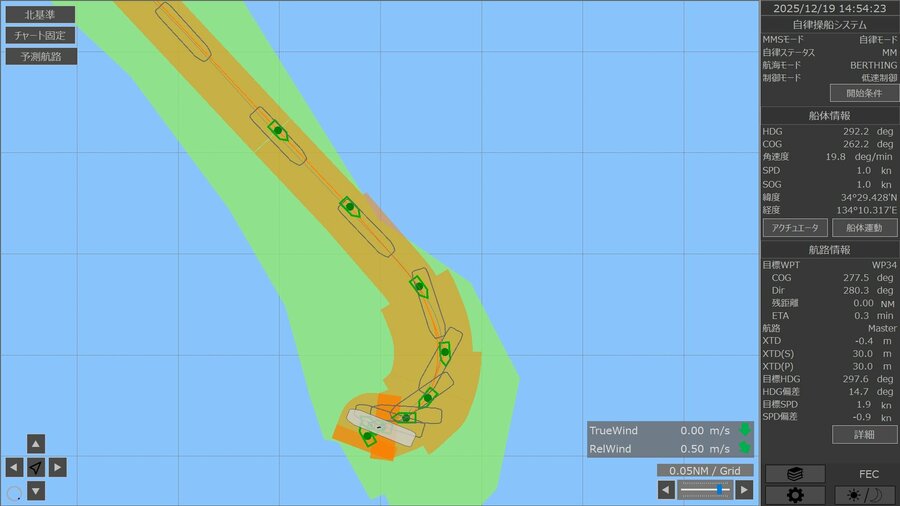 操船者が策定した航路や行動計画策定システムが策定した航路に従って、船体を自動で操船制御するシステム。プロペラ・舵・スラスタを制御することで船体を航路または目標に追従する。従来操船者が手動で行っていた操船をシステムが自動で制御することで操船者の負担を軽減し、安全性の向上に寄与します。