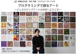 好評をいただいた2024年度に引き続き、今回も本学文学部メディア表現学科の高尾俊介准教授を講師に迎え、「プログラミングで創るアート 〜ジェネラティブアートの世界へようこそ〜」を実施します。