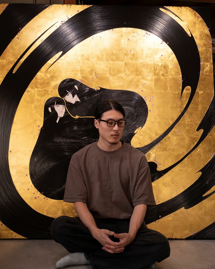代表作「麗髪(うるかみ)」は、刷毛で一筆描きした黒髪を通して、人に宿る気品や心の奥に潜む闇を映し出す。昭和のモデル・山口小夜子や当時の広告美術、日本古来の色彩や工芸に影響を受けながら、現代的な構成とマテリアルによって日本の美を再構築している。背景には永続性の象徴として純金箔を用い、変化し老いていく人の精神や身体との対比を生むことで、無常観を内包した美のあり方を提示している。
