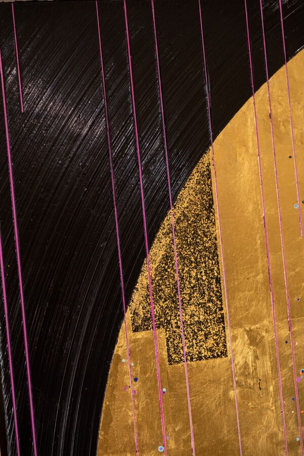 《麗髪 花と雨》2025、Acrylic on canvas 24k純金箔 金箔五毛色、1000×1000mm